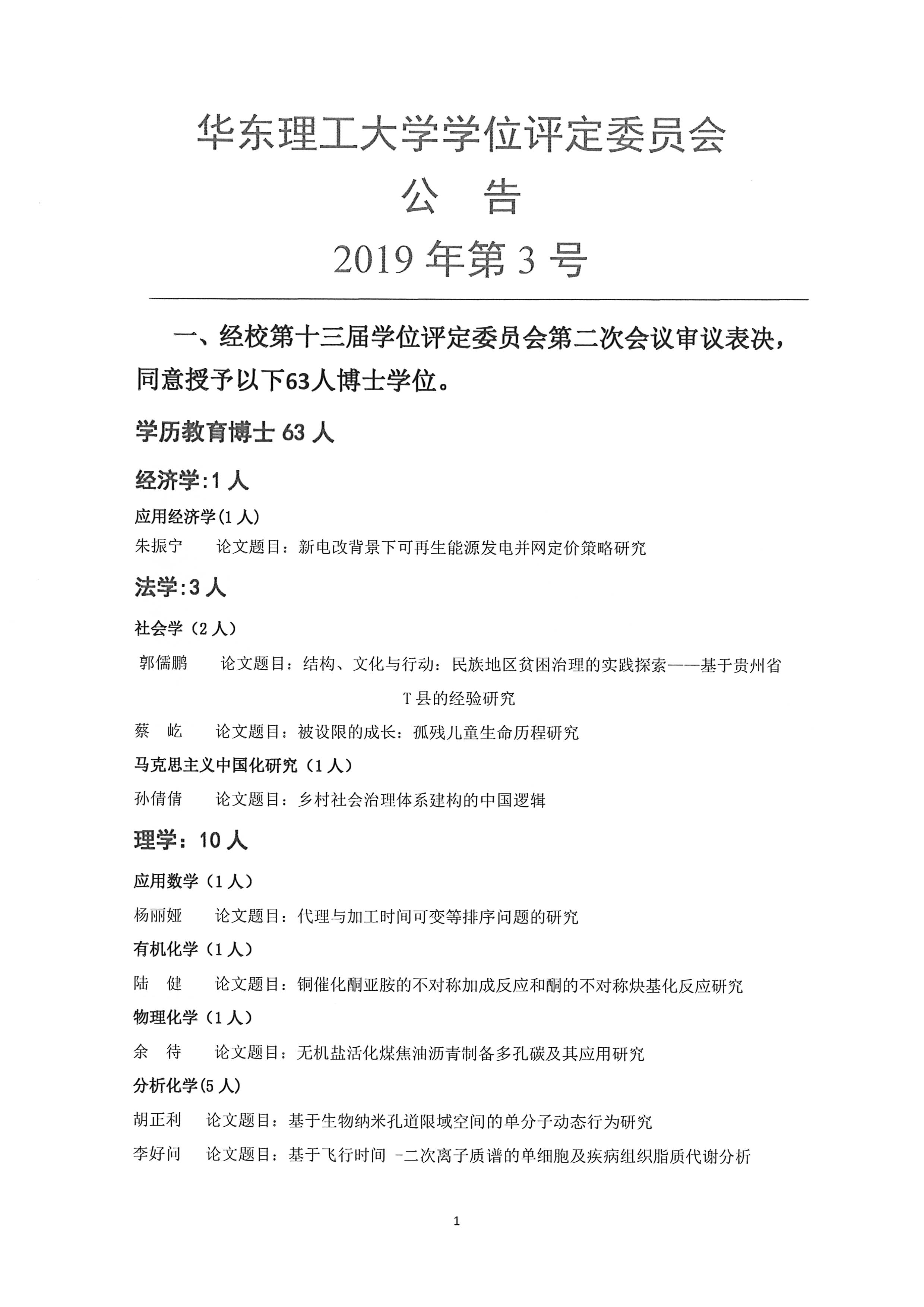 华东理工大学第十三届学位评定委员会第二次学位授予公告(2019年3号公告)