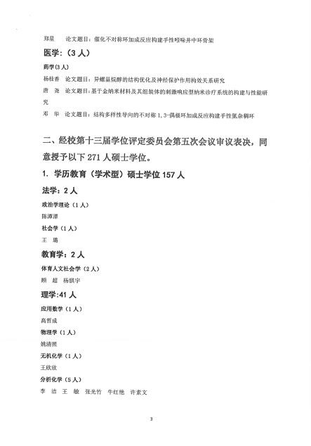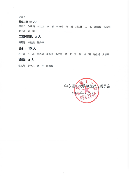 华东理工大学第十三届学位评定委员会第五次学位授予公告(2020年3号公告)