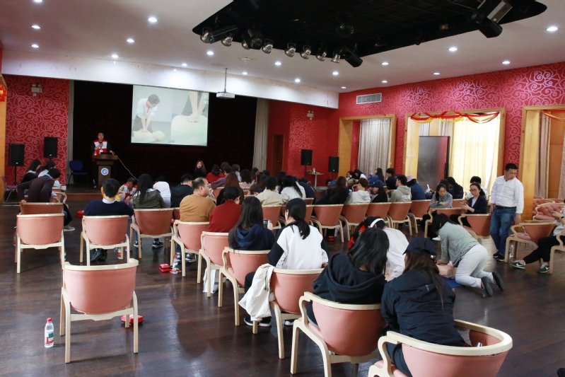 此次培训采用“理论授课+分组实操+现场考核”的模式。培训活动开始,徐汇区红十字会的专业讲师通过生动的图文演示和视频讲解,系统介绍了心肺复苏术(CPR)和自动体外除颤器(AED)的使用方法和操作指南。讲师还重点讲解了气道异物梗阻的识别与处理原则,绷带包扎、三角巾包扎等创伤救护的规范步骤和注意事项。培训过程中,徐汇区红十字会讲师运用经典的案例和详实的数据,使复杂的急救知识变得易于理解、容易上手。